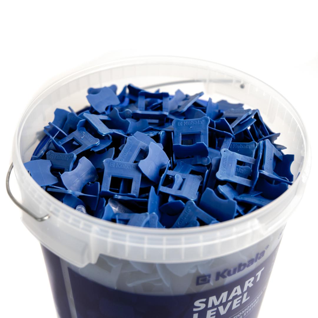 Seau transparent avec couvercle et graduation, contenant des clips SMART LEVEL de 1 mm d’épaisseur.
