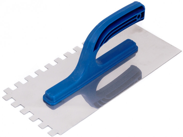 Гладилка из нержавеющего покрытия Сталь — используется в отделочных работах предназначена для быстрого равномерного нанесения, распределения и разравнивания на вертикальных и горизонтальных поверхностях строительных смесей и цемента. Полотно гладкое и ровное, выполнено из специальной нержавеющей стали, оснащено плоскими широкими зубьями 8х8 мм. Эти зубья позволяют при разравнивании создавать бороздки и канавки, которые в дальнейшем улучшают адгезию нанесенного слоя с последующим материалом. Удобная пластиковая ручка обеспечивает надежный стабильный хват и облегчает рабочий процесс. Изделие является легким, износостойким, легко отчищающимся от загрязнений и остатков рабочего материала.